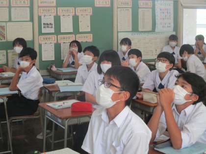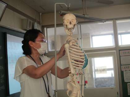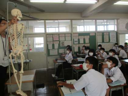 2年・授業風景 その2 公開日 2020/08/28 更新日 2020/08/28 今日の興南中 8月28日(金) 3限 2年2組の理科は、人体のしくみについて学習しました。 骨格標本「興南太郎くん」が初登場! 生徒は真剣なまなざしで見つめています!