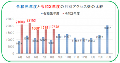 上のグラフは、昨年度(令和元年度)と今年度(令和2年度)の月別アクセス数を比較したものです。