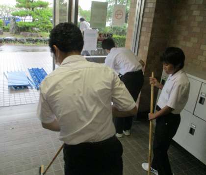 今朝は雨天のため、職員玄関内の清掃を行いました。(写真:上)