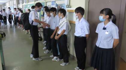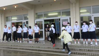 ▼生徒玄関前から「よろしくお願いしま〜す!!」