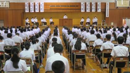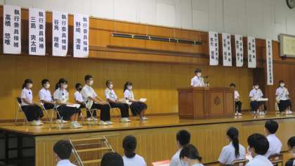 生徒会役員選挙の立会演説会を体育館で行いました。(写真)