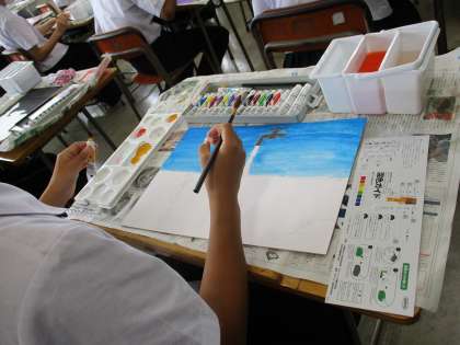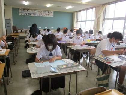 2年2組の美術は、美術室でポスターの着色をしていました。
