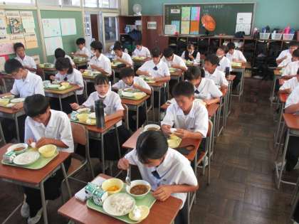 1年・カレー大好き! 公開日 2020/09/16 更新日 2020/09/16 今日の興南中 9月16日(水) 12:45 今日の給食のメニューは、「カレーライス・麦ごはん・牛乳・ゆで卵・フルーツゼリーミックス・味付け小魚」です。 (写真 下:1年1組のようす) カレー大好き! 1年生! いっぱい食べます!