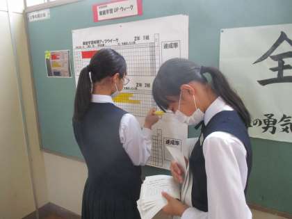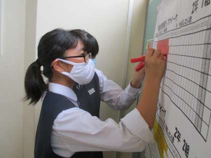学習実践部頑張っています! 公開日 2020/09/26 更新日 2020/09/26 今日の興南中 9月26日(土) 9:30 2年の学習実践部は、1日の学習時間「140分」を呼びかけています。 昨日の目標を達成した人数を学級別にグラフに掲示しています。 家庭学習を頑張りましょう!