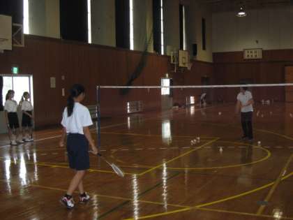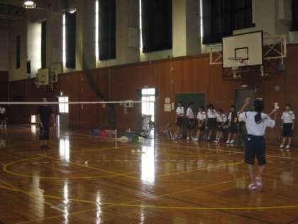 バドミントン部は、コーチと西野先生による基礎打ち練習です。