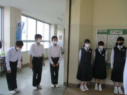 1年・週当番活動 公開日 2020/10/05 更新日 2020/10/05 今日の興南中 10月5日(月) 7:50 今週の週当番活動は、1年2組が担当しています。 雨の日の今朝は「あいさつ運動」をしました。 班ごとに場所を分担して、全校に明るい声を響かせます。 「明るく、目を見て、自分から!」 実践部の仕事も頑張っています。 (写真 上:4階西階段でのあいさつ) (写真 中:2階中央階段でのあいさつ) (写真 下:広報実践部は放送当番をしています。)