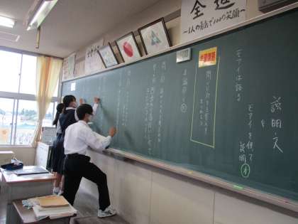 (写真 中:2年2組 国語 考えを黒板に書きます。)