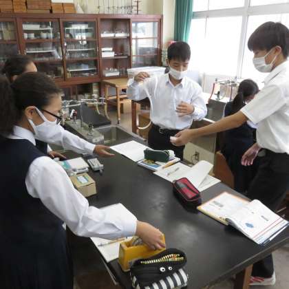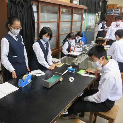 3年1組の理科は、科学室で「水平面での台車の運動」の実験をしました。