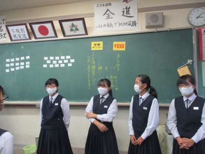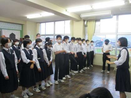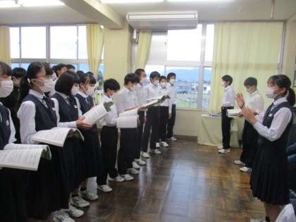 2年・合唱練習 公開日 2020/10/08 更新日 2020/10/08 今日の興南中 10月8日(木) 15:10 放課後合唱練習4日目です。 だんだん練習にも慣れ、練習の方法にも工夫がみられます。 (写真 上:2年1組 本日の課題の確認) (写真 中:2年2組 全員で声出しからスタート) (写真 下:2年3組 指揮者に合わせて)