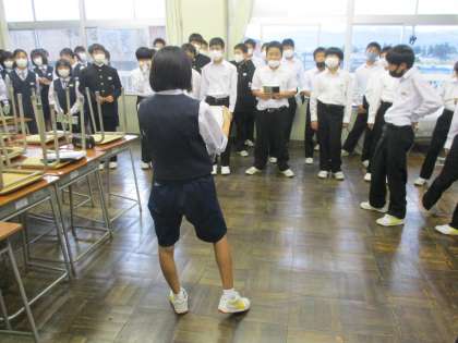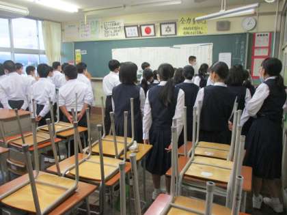 (写真 上:1年1組 リーダーが前で今日の重点を呼びかけます。)