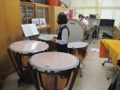 (写真 下:パーカッションパート CDに合わせて曲の進行を確認)