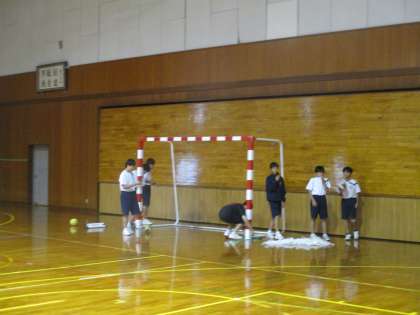 (写真 下:ゴールポストの準備をするハンドボール部)
