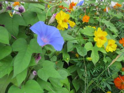 よく見ると、マリーゴールドに混じってアサガオの花が頑張って咲いています。