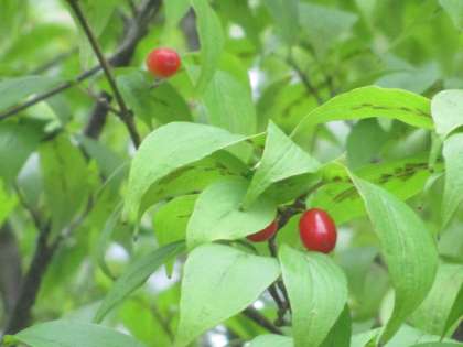今日、サンシュユの木に赤い実がついていることを見つけました。
