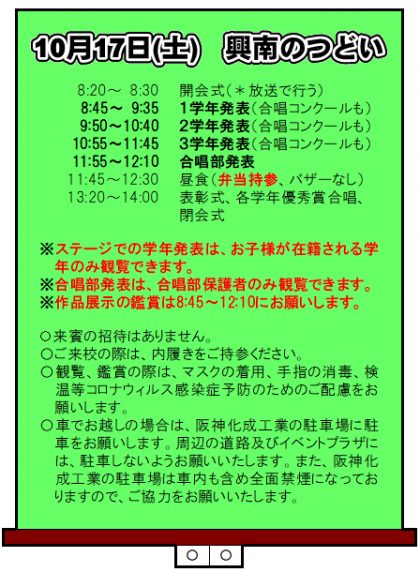 今週末は「興南のつどい」です! 公開日 2020/10/11 更新日 2020/10/11 今日の興南中 10月11日(日) 15:00 保護者のみなさんへ 今週末17日(土)は、「興南のつどい・合唱コンクール」です。 先日、お知らせのプリントを配布しましたが、今一度、下記の日程等をご確認ください。