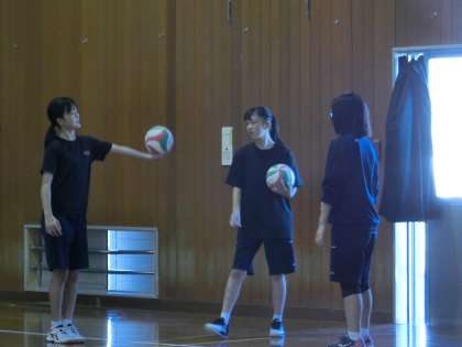 (写真 下:バレー部はサーブのコツを先輩から教わります。)