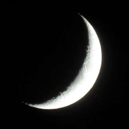 日の入りから約1時間後、あたりは真っ暗、南西の空に美しい三日月が見えました。(今日の日の入りは17:08です。)