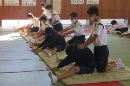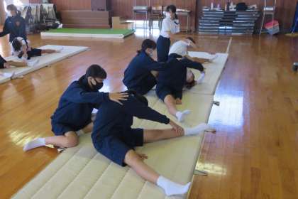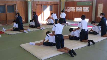 1年3組の体育は、武道館でマット運動の準備運動をしていました。