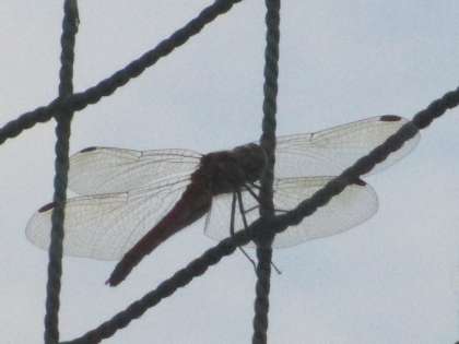 グラウンドのネットにとまる「アキアカネ」(写真:上)