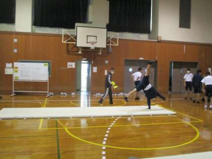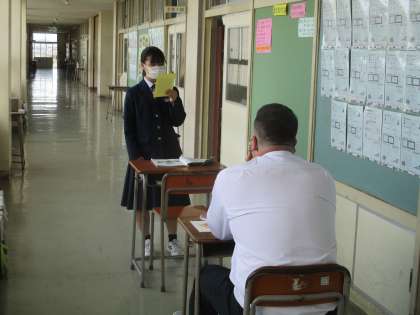 (写真 中:2年2組 英語 廊下で一人一人テストを受けています)