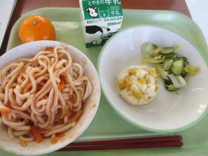 ソフト麺も大人気! 公開日 2020/10/27 更新日 2020/10/27 今日の興南中 10月27日(火) 給食 今日の給食の献立は、「ソフト麺のミートソースがけ、牛乳、蒸しパン、フレンチサラダ、みかん」でした。 久しぶりのソフト麺です。 ソフト麺は、カレーライスに次ぐ人気メニューですね!