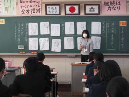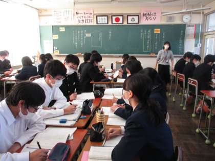 校内互見授業 公開日 2020/10/29 更新日 2020/10/29 今日の興南中 10月29日(木) 6限 3年2組では国語の互見授業を行いました。 「奥の細道」を題材に、旅に対する芭蕉の考え方について理解を深めるという課題に取り組みました。 生徒は、現代の旅と芭蕉の旅を比較しながら、班で話し合いました。