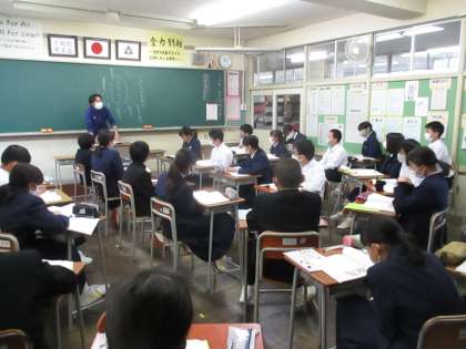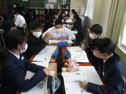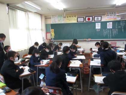 1年・道徳 公開日 2020/11/04 更新日 2020/11/04 今日の興南中 11月4日(水) 3限 今日の教材は「地下鉄で」です。 地下鉄で席をゆずる少女たちの行動を見た筆者が感じた「少女たちの中にある美しさ」について考え、他者への思いやりや親切な心について改めて考え直す機会となりました。 (写真 上:1年1組 中:1年2組 下:1年3組)