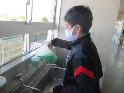 放課後の光景 その1 公開日 2020/11/05 更新日 2020/11/05 今日の興南中 11月5日(木) 16:00 陸上競技部の練習前に手洗い場の洗浄液を補充する保健実践部員です。 ありがとう!