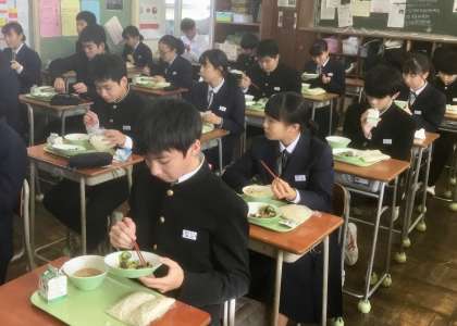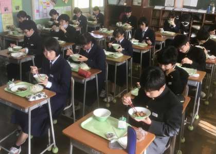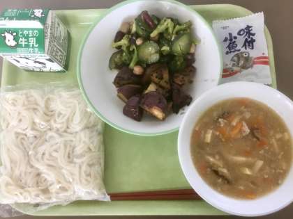 ソフト麺だ〜い好き! 公開日 2020/11/10 更新日 2020/11/10 今日の興南中 11月10日(火) 給食 今日の給食の献立は、「ソフト麺の肉みそがけ・牛乳・大学いも・ビーンズサラダ・味付小魚」でした。(写真:上) ソフト麺は、カレーライスに次ぐ、「No.2人気メニュー」です! (写真 中:3年3組のようす 下:3年2組のようす) 3年生の食欲は旺盛です!