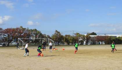 グラウンドでは、サッカー部がパス回しやゲームを行いました。
