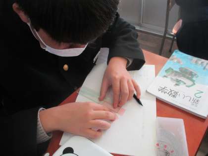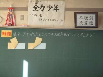 紙テープを利用して二等辺三角形の底角が等しいことを証明しています。