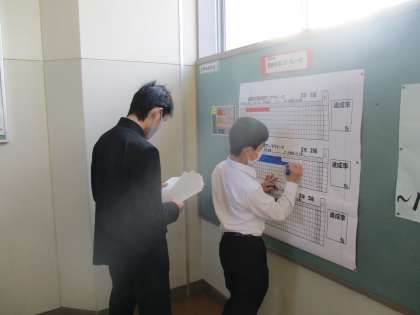 学習実践部では、期末評価期間中の家庭学習時間を確認してグラフによる「学年・学級の頑張りの見える化」を行っています。