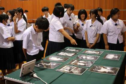 休憩中には、「紙切り」の作品展示に生徒が群がり、巧みな技に感心させられていました。