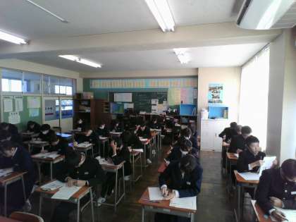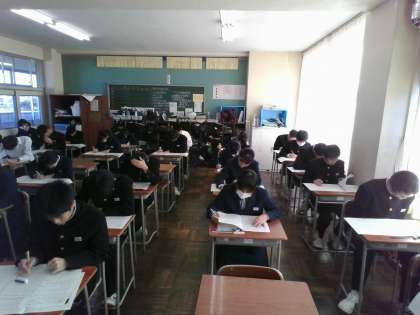 いよいよ大切な2学期末考査が始まりました。3年生の今日の教科は、保健体育・英語・技術家庭科です。今までの学習を思い出しながら、懸命に解答用紙に書き込んでいます!