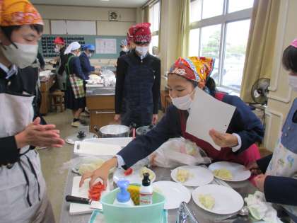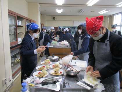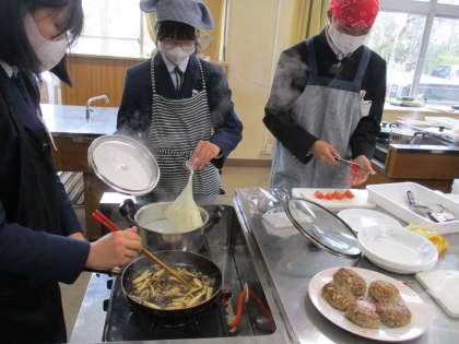 2年3組・家庭科・調理実習 公開日 2024/12/11 更新日 2024/12/11 2年生 12月9日(月) 3、4限 2年3組では家庭科の授業で調理実習を行い、煮込みハンバーグと蒸しパンを作りました。 とても楽しそうに活動し、「自分で作ったハンバーグはおいしかった」と言っている生徒がたくさんいました。 調理実習、大成功ですね!