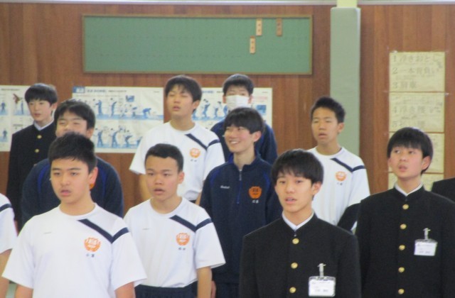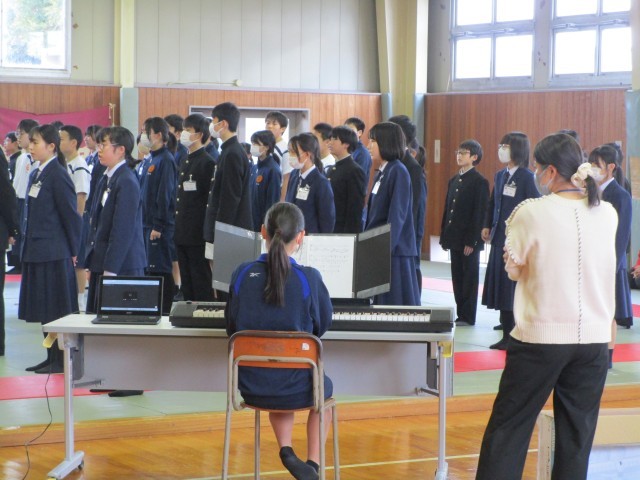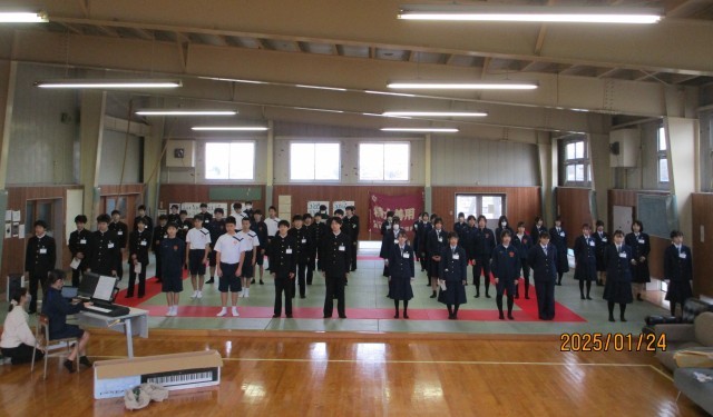 1年生「新入生説明会」に向けて②校歌チーム 公開日 2025/01/27 更新日 2025/01/24 1年生 校歌チームの練習の様子です。今日はクロムブックからの音源ではなく、キーボードを使っての伴奏に合わせて歌いました。並び方を変え、言葉をはっきりするように頑張りました。校歌を通して、入学してくる後輩たちにどんなメッセージが届くかな。