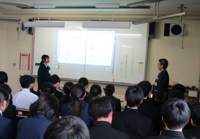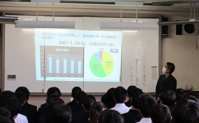 2月12日(水)1年生「SNS危険防止講演会」 公開日 2025/02/14 更新日 2025/02/14 1年生 1年生は、6限に会議室で「SNS危険防止講演会」がありました。講師にお招きしたのは、県警察本部少年サポートセンター東部分室の方です。最近中高生の間で起こっているSNSのトラブルや、私たちが普段からどんなことに気を付けてメディアと接しなければならないことを一緒に考えました。実例を含めてされたお話に、皆真剣な面持ちで聞いていました。講演会の後、各教室で感想を書きました。