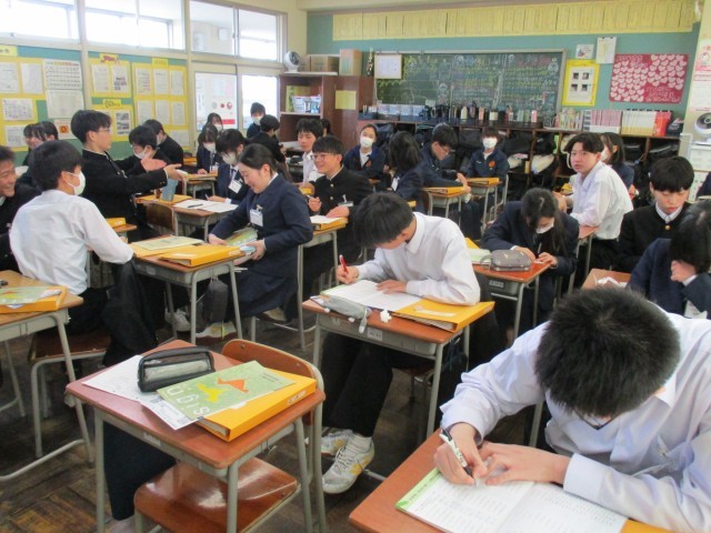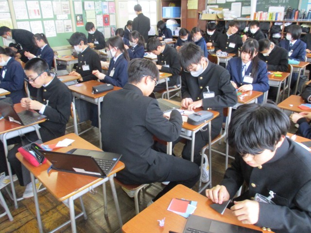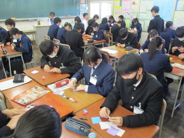 2年生・平和学習 公開日 2025/03/10 更新日 2025/03/07 2年生 3月7日(金) 5限今日の総合的な学習の時間では、平和学習の一環として、平和への祈りを込めて千羽鶴を折りました。「初めて折ったわりには、意外にうまくできた。」と嬉しそうに話している生徒もいました。