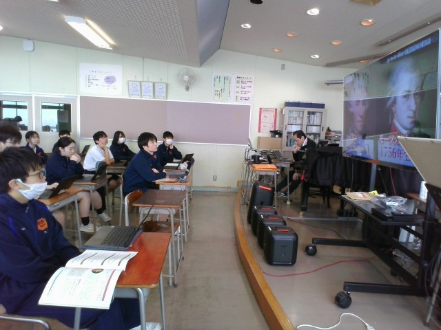 「名曲について知ろう〜世界三大交響曲〜」という課題で、交響曲についての解説動画を視聴しながら学習しました。板書の代わりに授業者がリアルタイムに入力したドキュメントを共有したり、チャットを活用して意見交流を行ったりして学びを深めました。自分の気付きや疑問を気軽につぶやき、他の生徒のつぶやきにもコメントを返すなど、楽しそうに学習に取り組む姿が見られました。