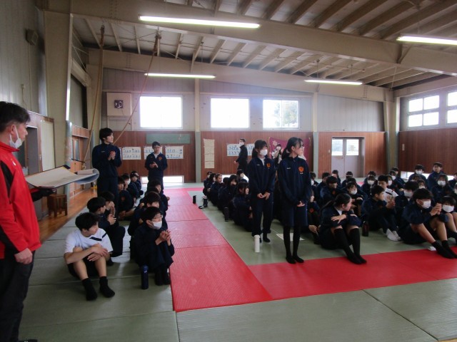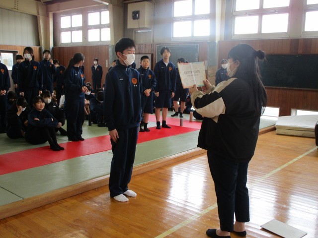 1年生 学年末の学年集会 公開日 2025/03/21 更新日 2025/03/21 1年生 1学年最後の学年集会では、皆勤賞の表彰、英語チャレンジ(人称代名詞のグレードテスト)の表彰、そして、各先生方から春休みの生活・学習・部活動についての話、終わりに学年主任の話がありました。最後には1学年全体で写真を撮りました。来年度に向けてそれぞれにステップアップしてほしいです。