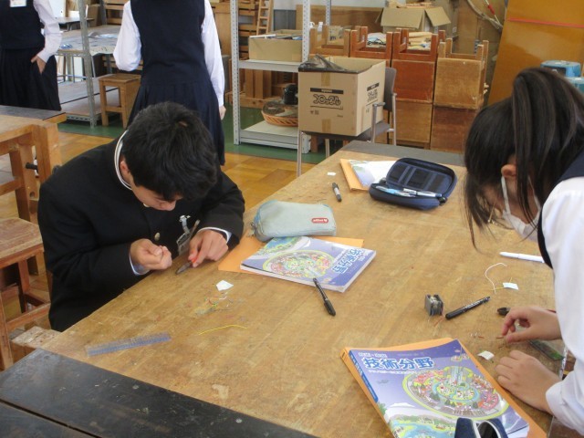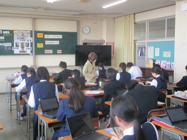 1組の英語は、「SHOW」の表現について確認しました。2組の技術では、ニッパの使い方を確認し、実際に使ってみました。3組の美術は、仏像の特徴について学習しました。様々な学習に興味をもって取り組む姿が素敵です。