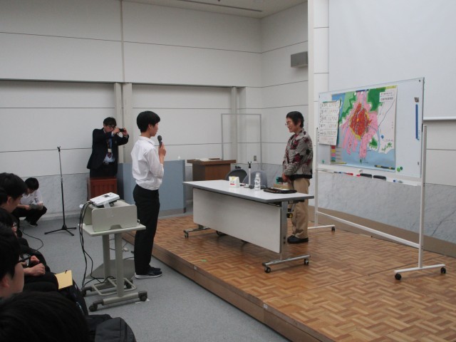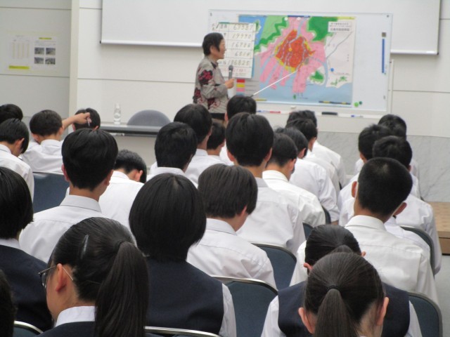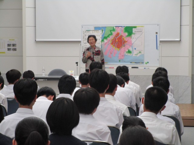 講話の様子です。胎内被爆された語り部の方のお話を聞きました。生徒に感想を聞くと「お母さんが、お腹が大きい状態にもかかわらず、苦しんでいる人を助けに言ったことに感動しました」と教えてくれました。平和への思いを後世につないでいきたいですね。