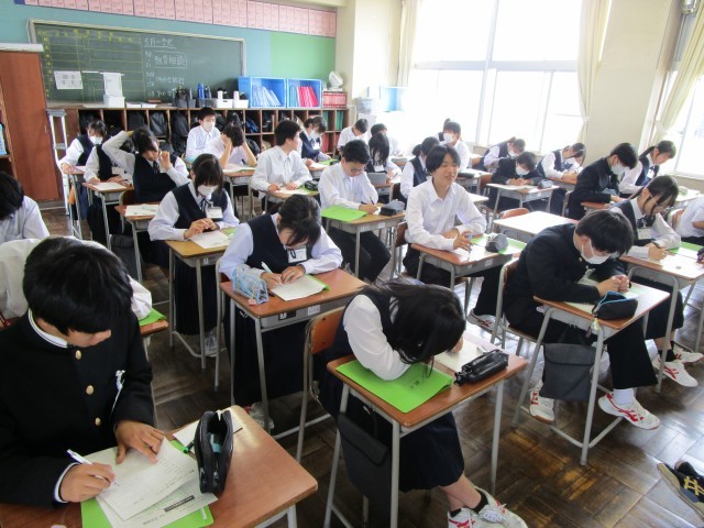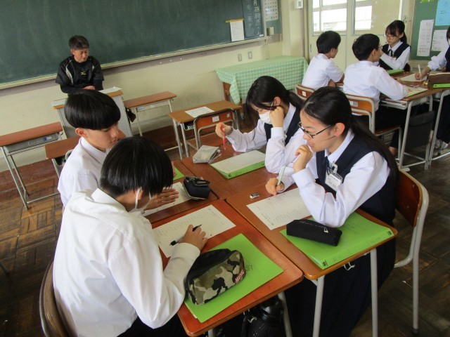 今日は5限目に、「社会に学ぶ『14歳の挑戦』」の事前学習をしました。今日学習したのは、相手にどう話すのがよいのかを考える「話し方」と「敬語の使い方」についてです。人と接するときには真心のこもったマナーで対応することが大事。普段、友達といると気にすることもないのですが、大人が相手の「14歳の挑戦」は気を遣って話すことが大切です。写真上:1組 写真下:2組