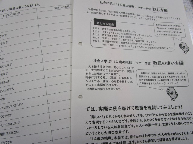 ワークシートを遣い、グループで考えています。日頃職員室へ用事があるときに、どのように自分の用事を伝えているでしょう。そして、職場体験中にあわてないように言い方を学びましょう。今週末には、「マナーアップでかかわり力を高めよう!」のタイトルでマナー講座が行われ、実りある「14歳の挑戦」にするためにマナーの基本や実践的なトレーニングをする予定です。事前学習で、必要な言葉を何度も何度も練習して、落ち着いて、安心して取り組める「14歳の挑戦」にしましょう。