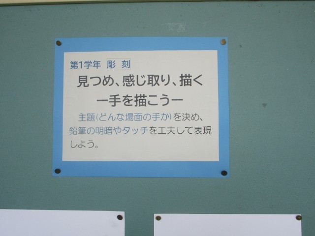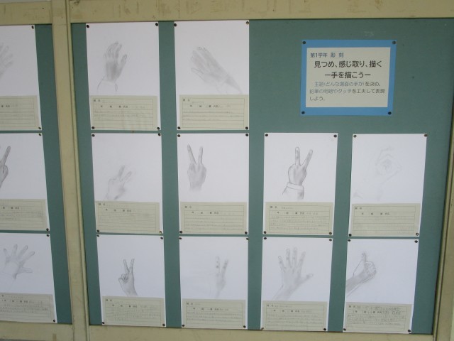 1年生は、鉛筆で自分の手をデッサンしました。普段何気なく見ているものも、じっと見つめることで新しい気づきがあるかもしれませんね。それぞれび作品は、特徴をとらえて描かれています。