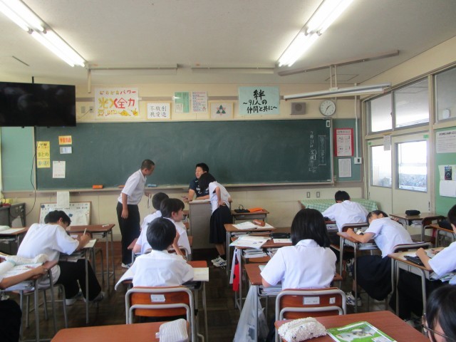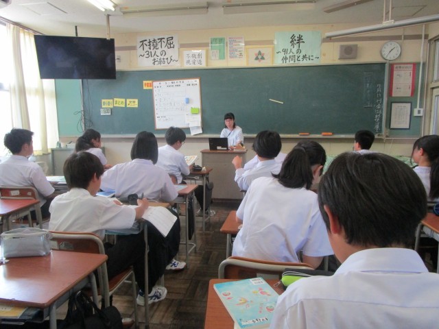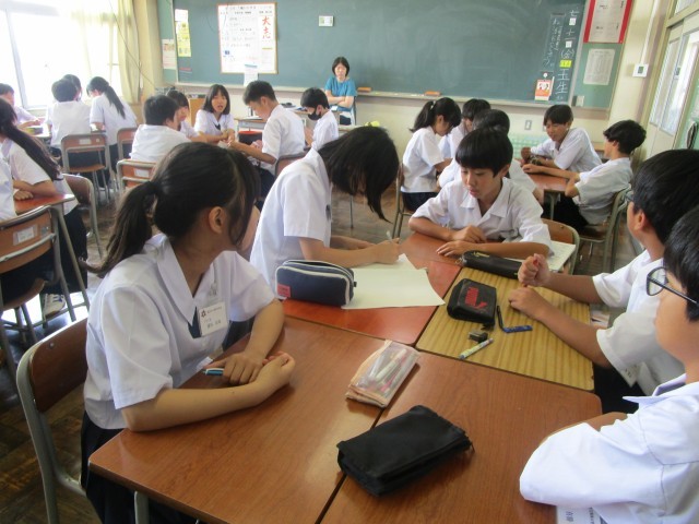 1年生の学級活動の様子です。1学期の活動の振り返りを行ったあとに、10月に実施する合唱コンクールの曲を決めるために候補曲を聞きました。1年生は、中学校に入って、最初のコンクールです。クラスで1つの曲を創り上げる大切な行事です。クラスの和が深まるといいですね。