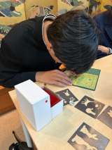 金箔貼り体験をしています!金箔の薄さに驚きながら、慎重かつ丁寧に作業しています。