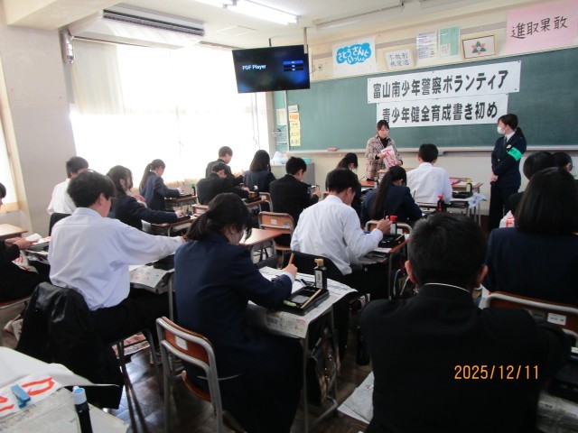 本日2年生の教室で『青少年健全育成書き初め行事』を行いました。この取り組みは、富...