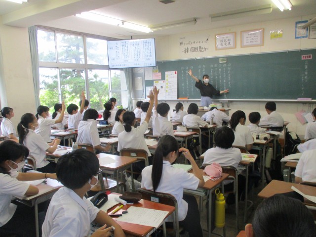 7月15日(火)1学年 授業風景 公開日 2025/07/15 更新日 2025/07/15 1学年 1年生の授業の様子を紹介します。【画像1・2】学活:夏休みの生活について【画像3】英語:”How many ~”の質問をたずねよう 答えよう【画像4】数学:数量の関係を、文字を使って表そう【画像5】国語:文法「言葉の単位」 +2 1学年