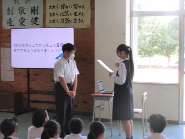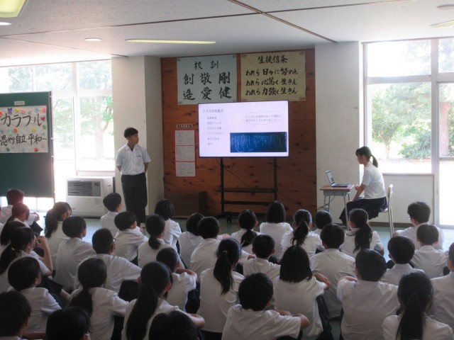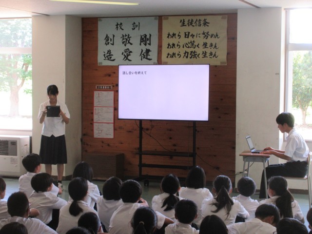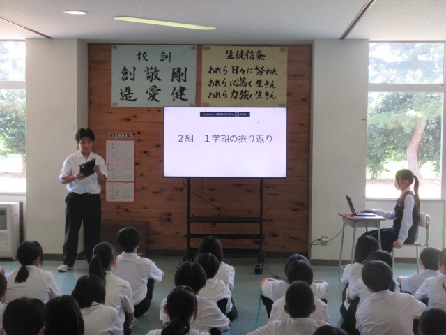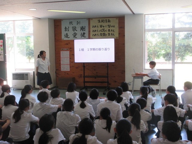 学年生徒会主催の学年集会を行いました。先日各学級で1学期の振り返りを行い、学級の良い面や課題について話し合った内容を学年で共有しました。よりよい学級、学年をつくるために決意を新たにしました。最後に、時間を守る取組である「チャイムでGo!」で優秀な成績を収めた1組に賞状をおくりました。大きな拍手で仲間の頑張りを称えました。これからの1年生の成長に期待できそうです。